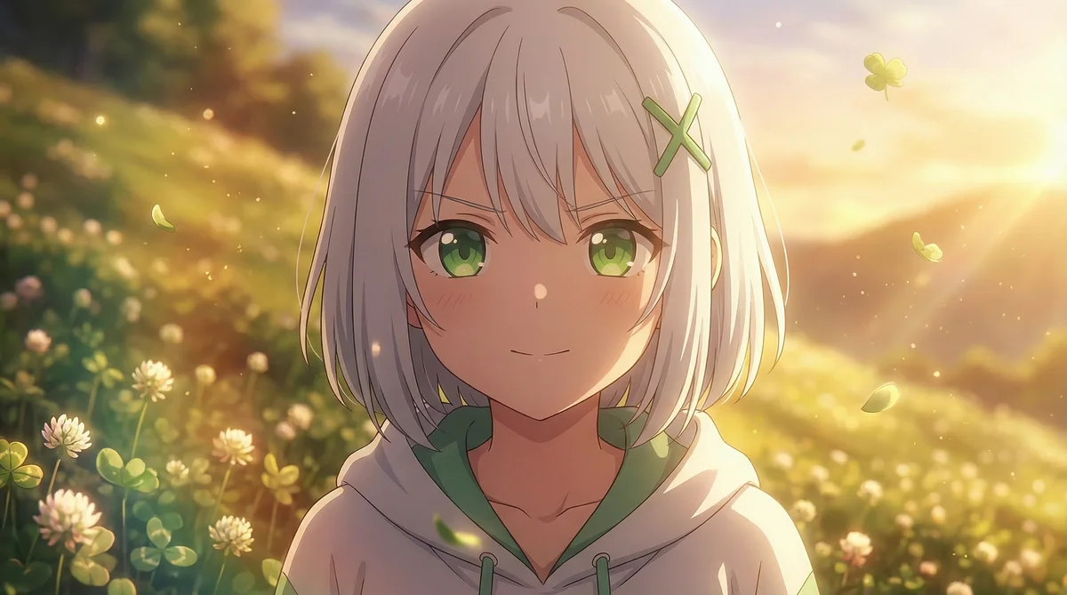"scene_description": "Anime-style portrait of a young girl with short silver hair and green eyes standing in a sunlit clover field at golden hour. Foreground centered on face and upper torso; blurred meadow and hills recede into warm bokeh. Floating clover leaves and light particles add motion; soft sun rays from right background create rim highlights.",