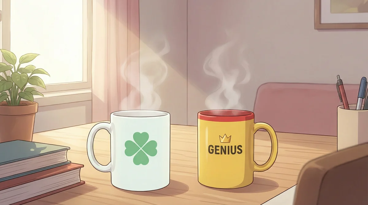 【無敗詠天&米之ラン】デスクで一息つく二人の日常。四つ葉のクローバーと「GENIUS」ロゴのマグカップが、それぞれの個性と揺るぎない絆を物語ります。温かい飲み物と共に、次なる勝利や閃きが生まれる予感に満ちた穏やかなひとときです。