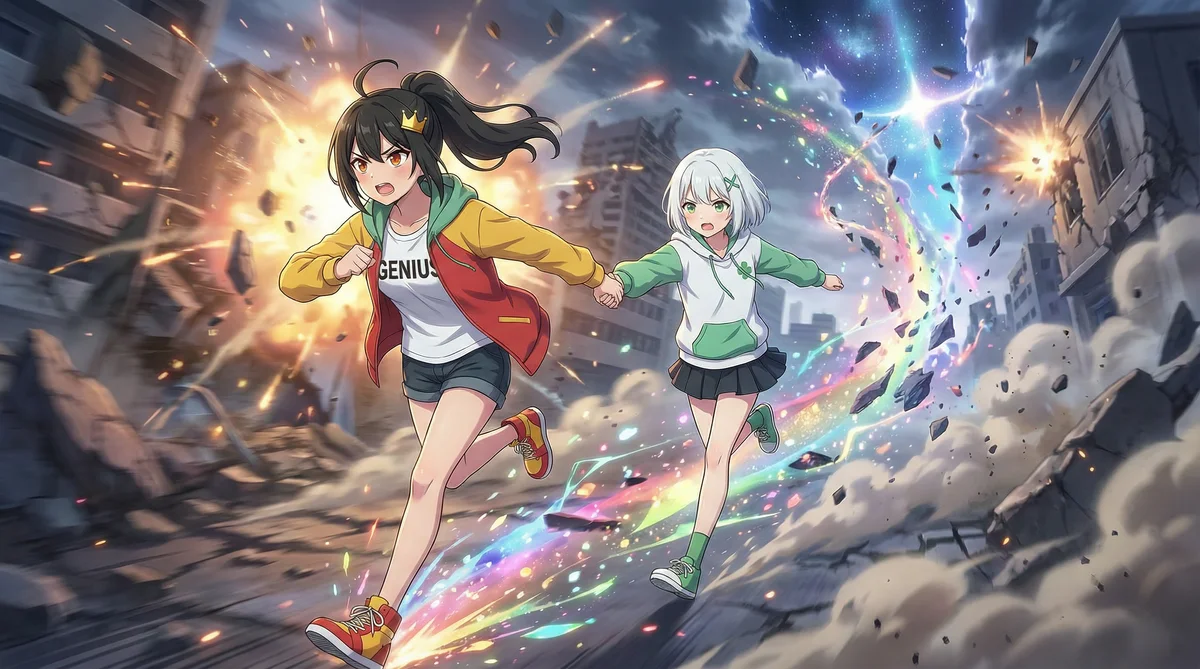 廃墟と化した都市で、無敗詠天と米之ランが手を取り、爆発の危機を乗り越えようと駆ける。虹色の光が二人の絆を彩り、絶望の中にも希望を感じさせるアクションシーン。