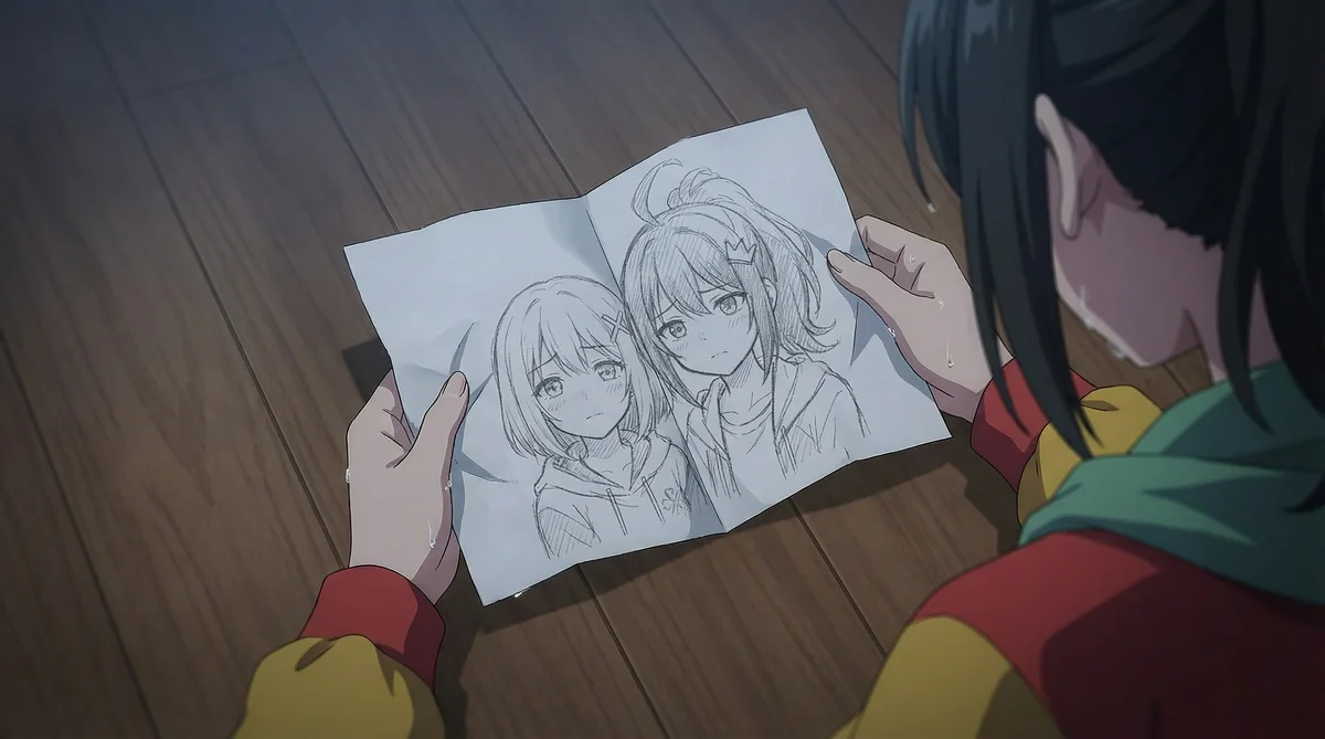 "scene_description": "Top-down indoor scene: a person (viewed from behind/right) kneels or sits on wooden floor holding a folded pencil sketch on white paper. Sketch shows two young female characters drawn in manga/anime style. Hands and forearms of the holder visible; slight sweat or tear streaks on skin. Floorboards run diagonally across frame. Overall quiet, intimate mood.",
