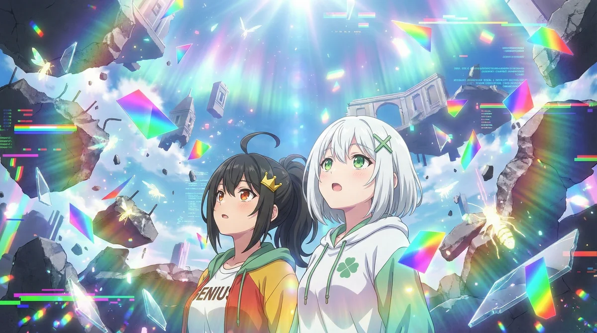 "scene_description": "Two anime-style girls in foreground gaze upward amid a fragmented, floating-ruins sky filled with prismatic glass shards, rainbow light beams, small flying insects/energy motes and distant architectural debris. Bright central light source at top creates radiating aurora-like colors; scattered HUD-like text and color bars add techno-fantasy overlay.",