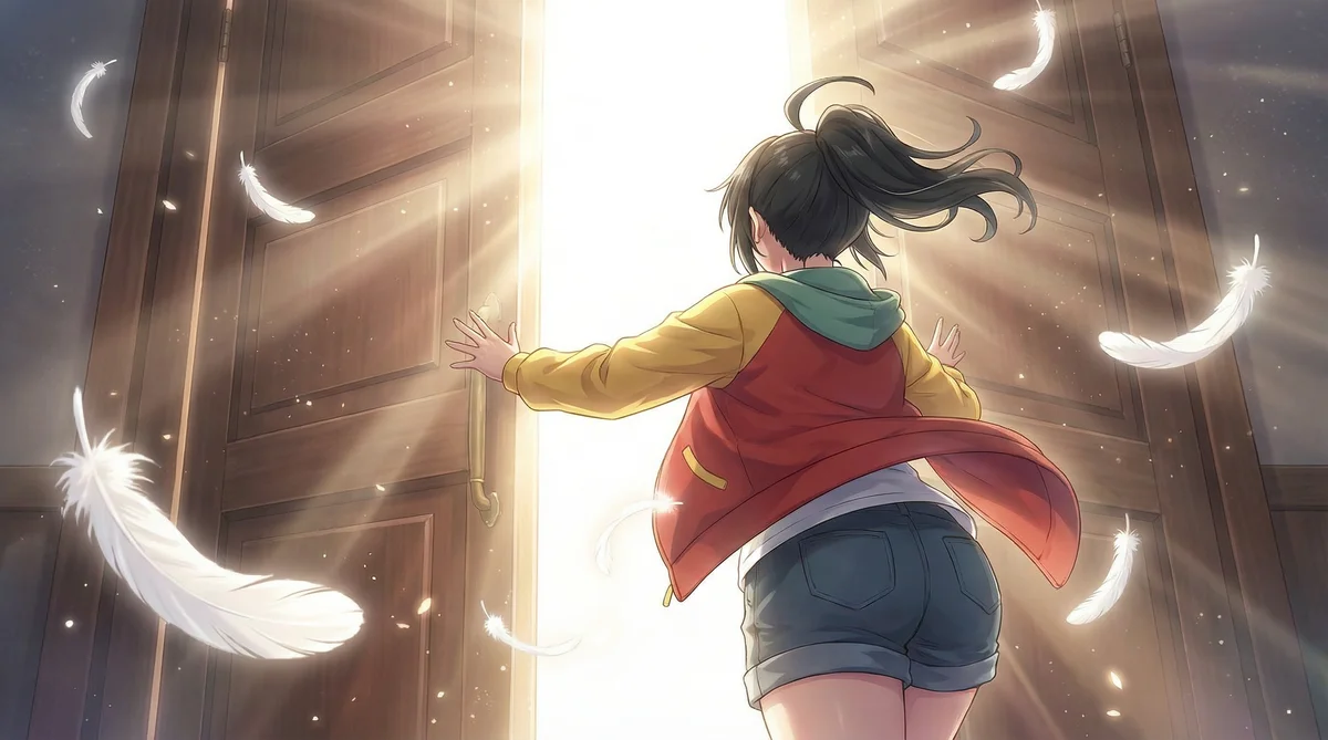 "scene_description": "Anime-style illustration of a young person pushing open large wooden double doors to a blazing white light beyond; floating white feathers and dust motes scatter in warm rays; figure seen from behind in mid-step, hair and jacket blown by implied breeze.",