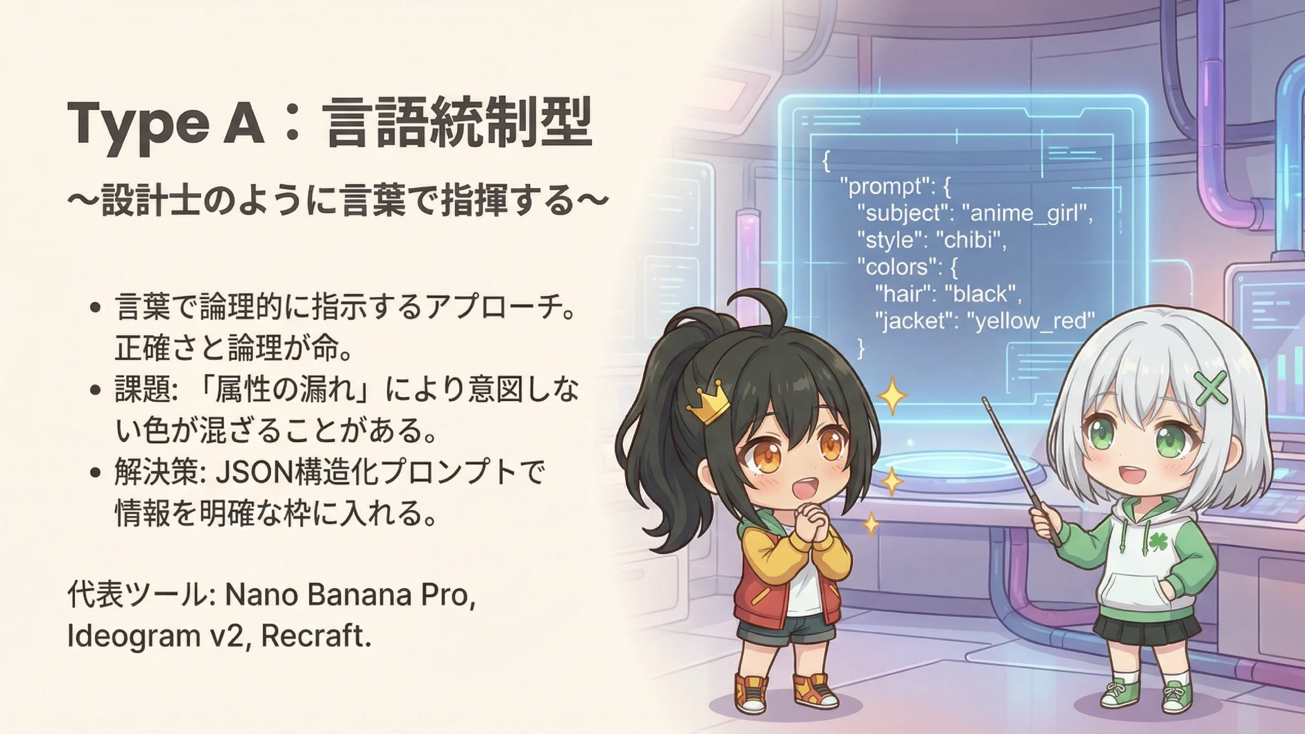 そこで最新のType Aツールは「JSON(ジェイソン)構造化プロンプト」という技術を採用しています。これは、マークシートの回答用紙のように、情報を明確な枠に入れて指示する方法です。