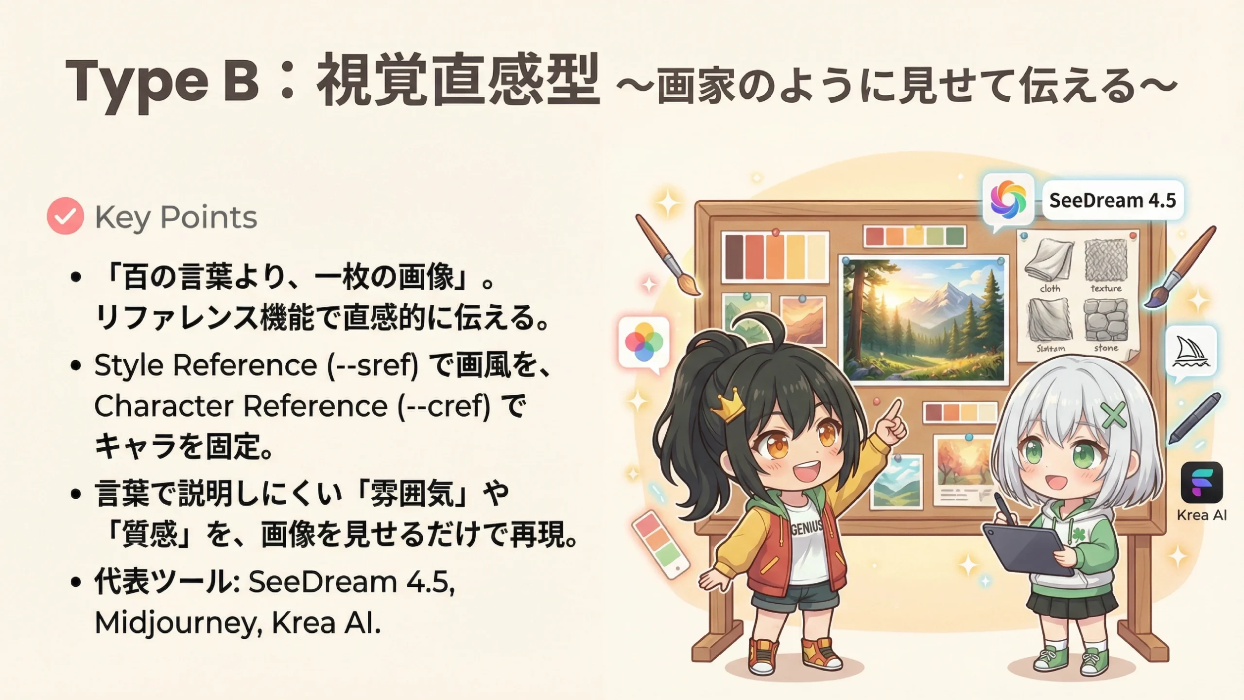 まさにその通りです。Type Bは、ムードボード制作、コンセプトアート、ストーリーボード、直感的なアイデア出しに向いていますね。