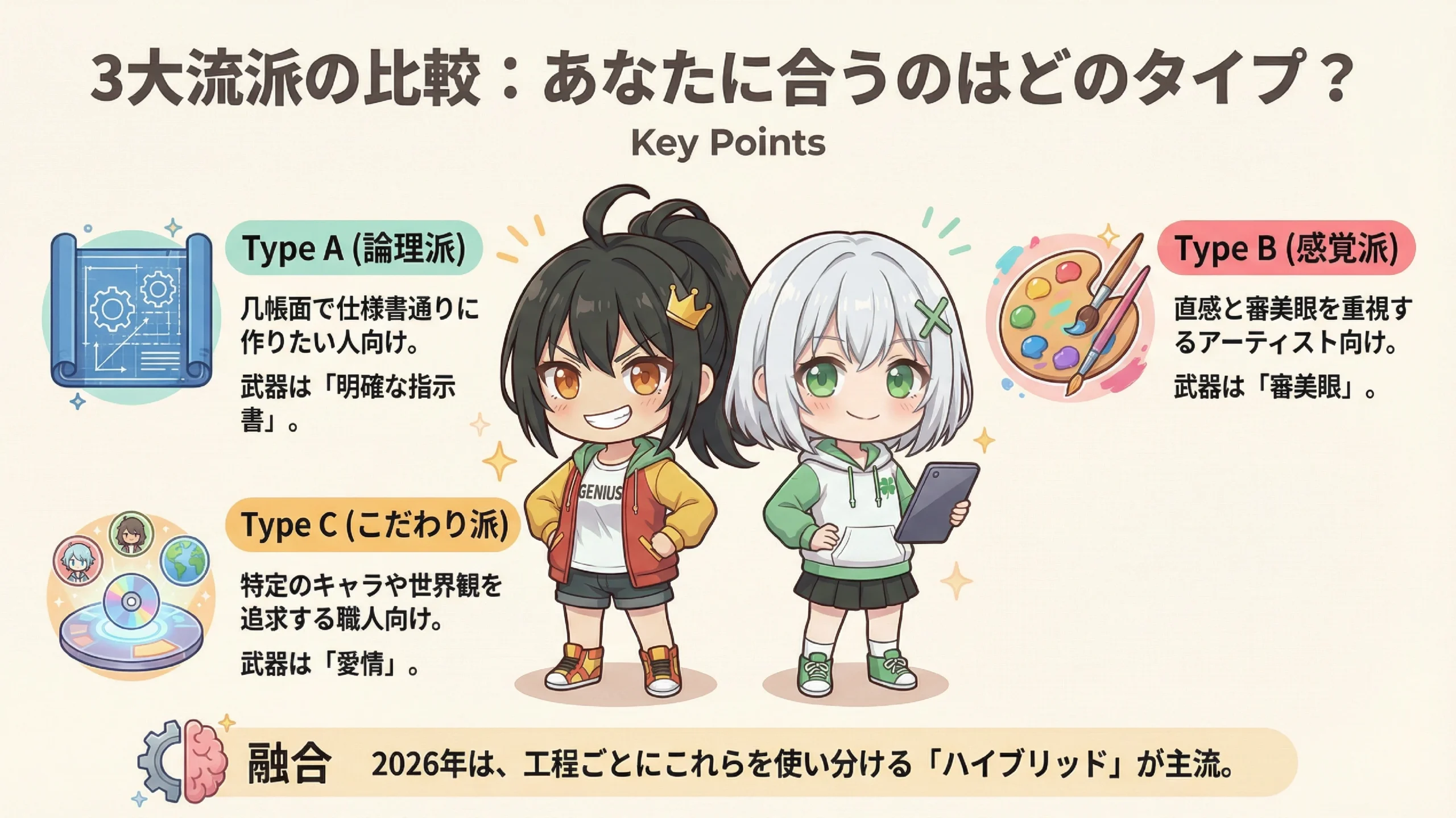 なるほどね...Type Cは「自分専用の職人AI」を作る感じね。漫画家さんやVTuberさんみたいに、同じキャラを何度も描く人には最強だわ!