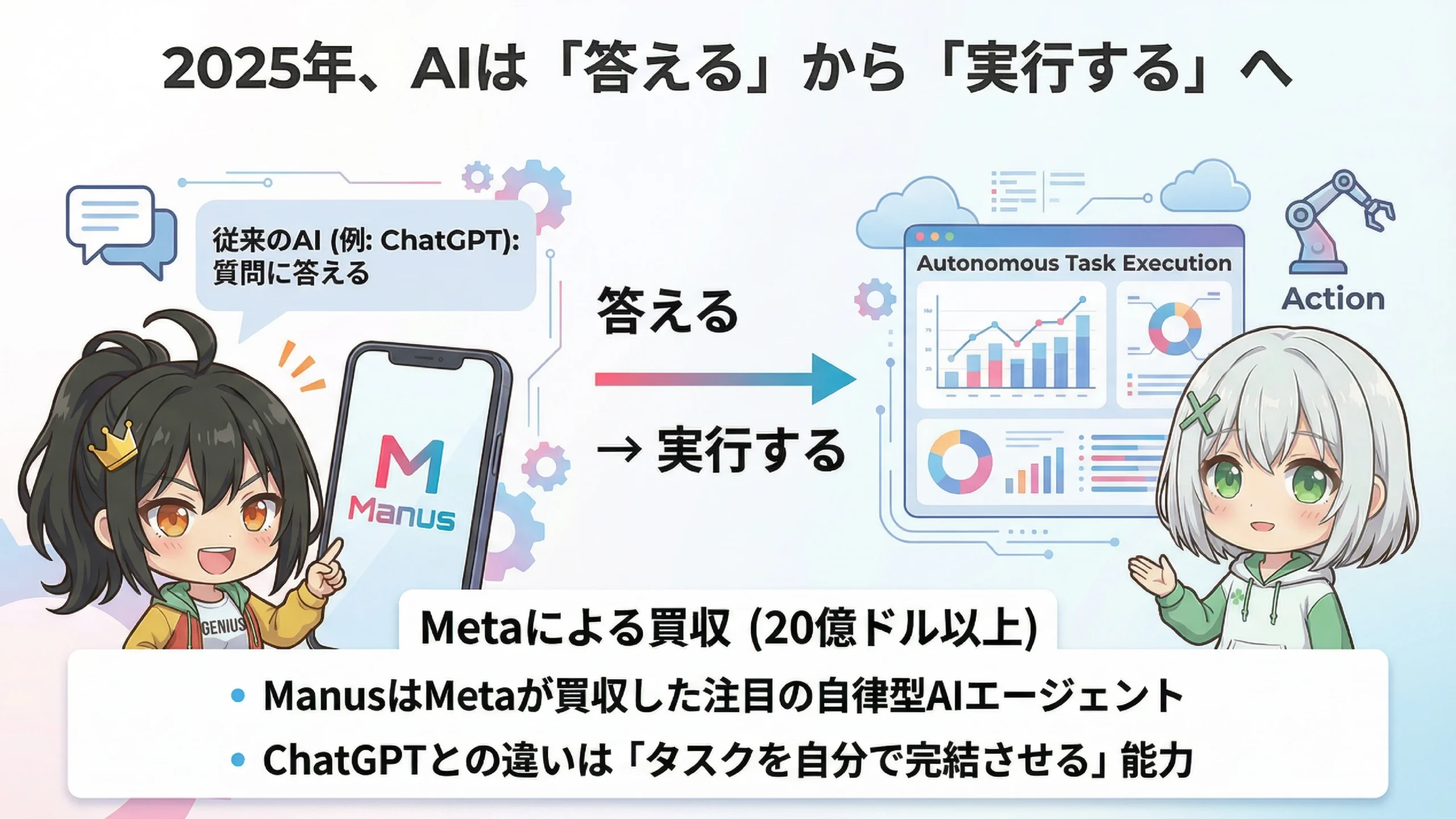 ラン!ラン!聞いてよ!最近「Manus」っていうAIがすっごく話題になってるの知ってる!?なんでもMetaが買収したとかで、めちゃくちゃすごいらしいのよ!