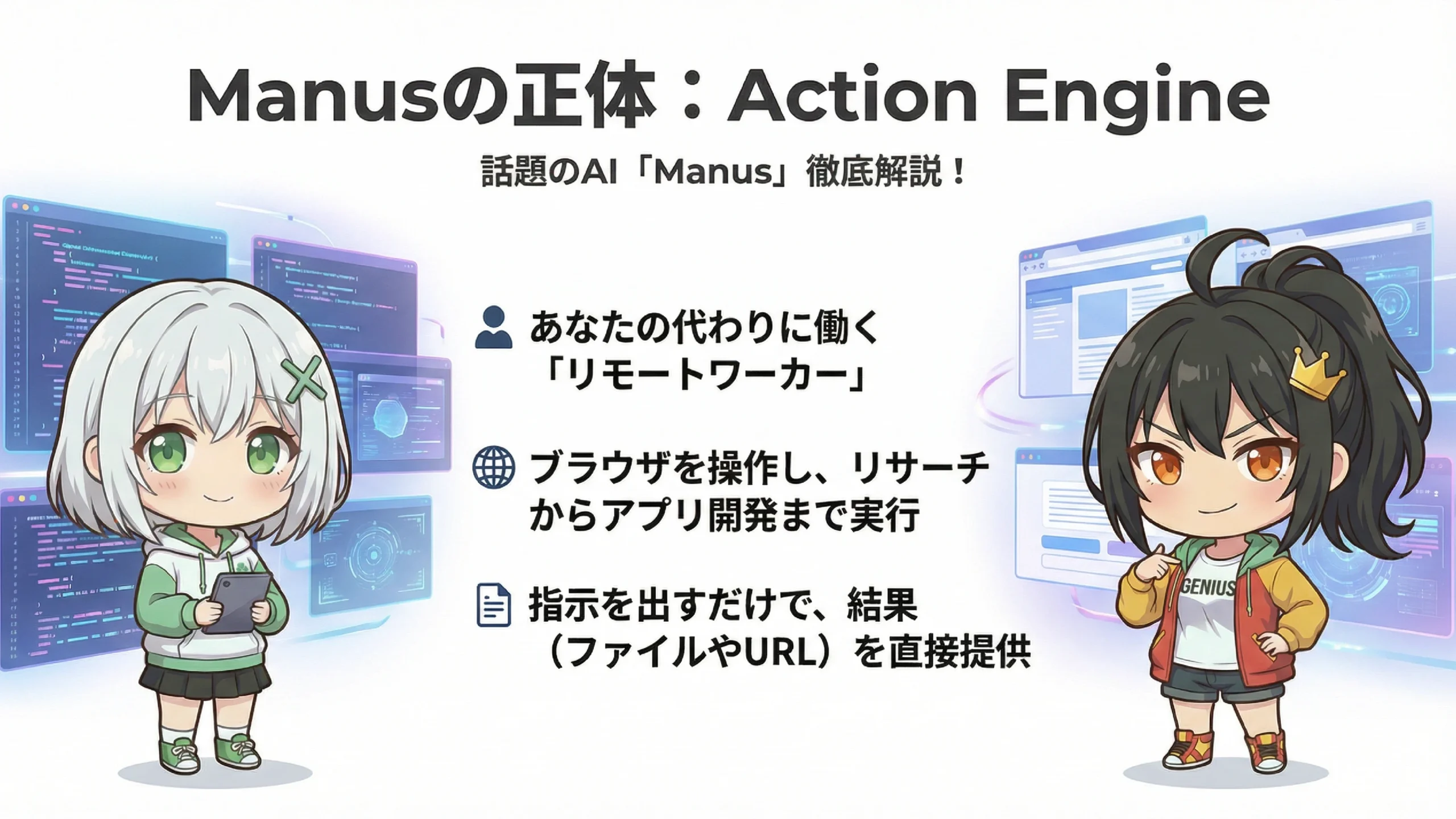 まさにその表現がぴったりですね。Manusは「Action Engine(行動エンジン)」と呼ばれていて、単なる情報検索ツールというより「リモートワーカー」に近い感覚で使えるのが特徴なんです。