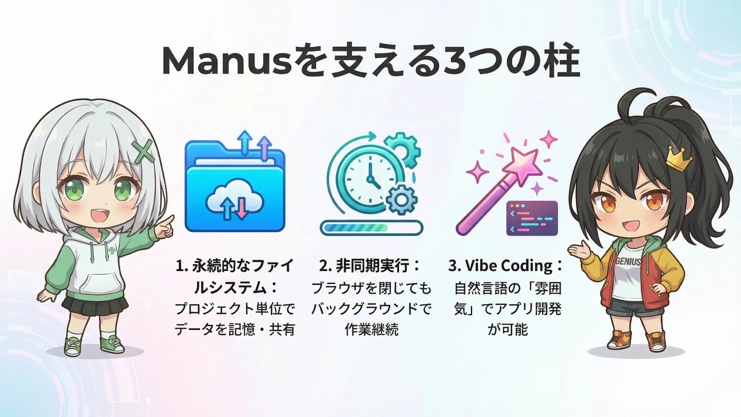 というわけで、今日はここまで!AIエージェントの世界、これからもどんどん面白くなりそうね!みんなもManusを試してみてね!またね〜!