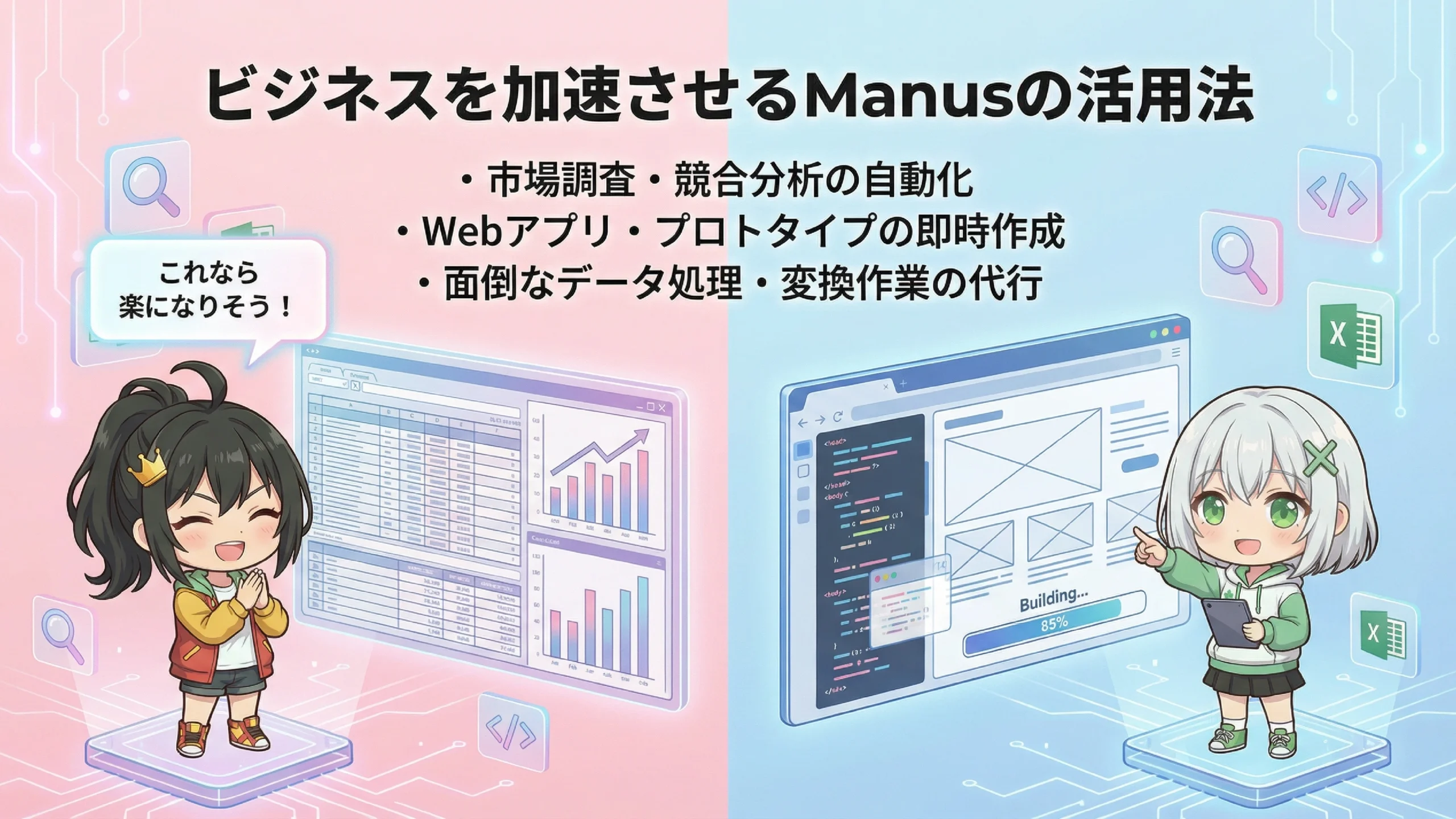 その通りです!どんな道具も使い方次第ですからね。Manusが得意な「プロトタイピング」「リサーチ」「資料作成」などの分野で活用すると、非常に高い効果を発揮してくれると思いますよ。