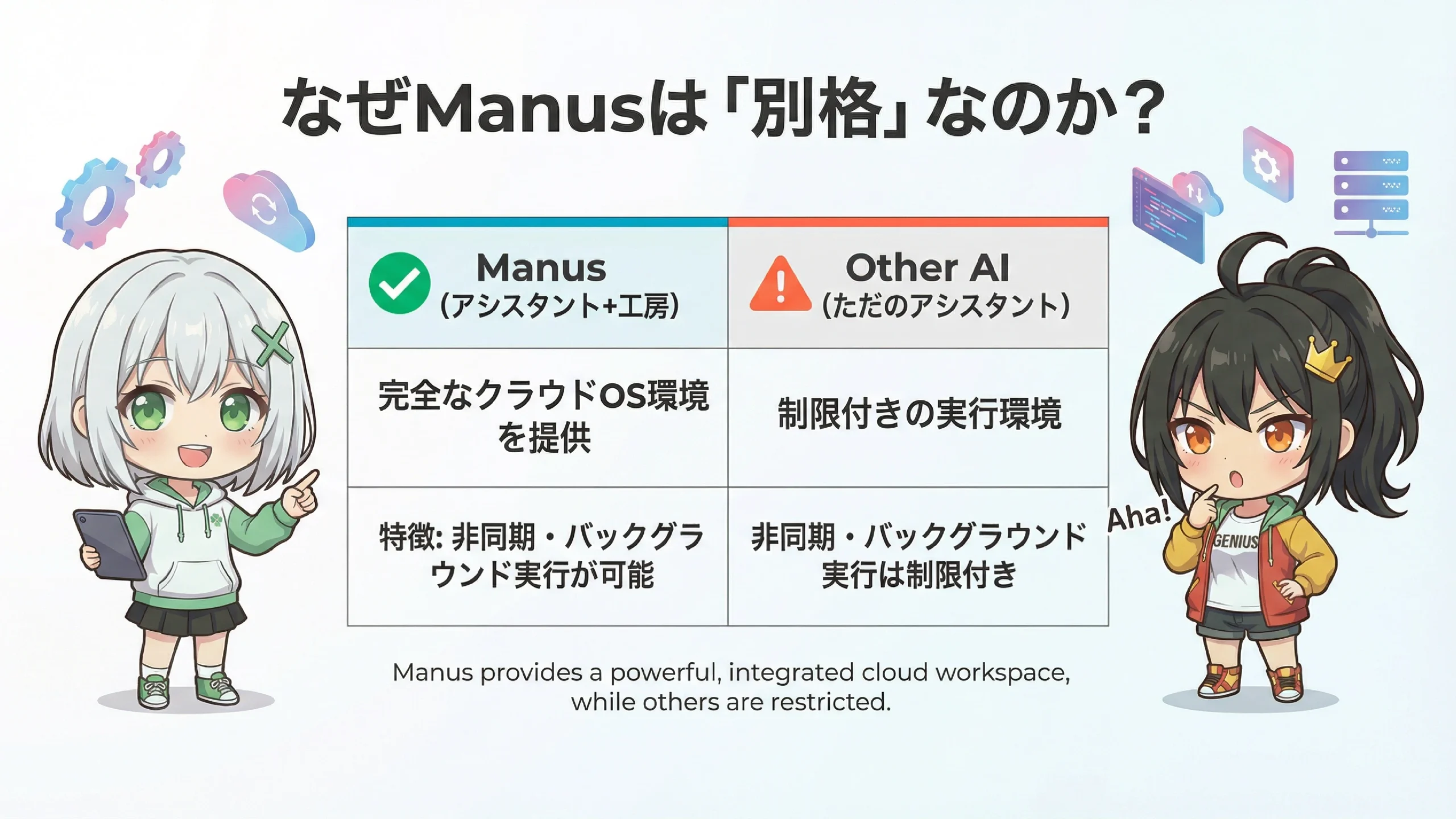 なるほど...Manusは「環境そのもの」を提供してくれるのね。ChatGPTがアシスタントだとしたら、Manusは作業場付きのアシスタントって感じかしら?