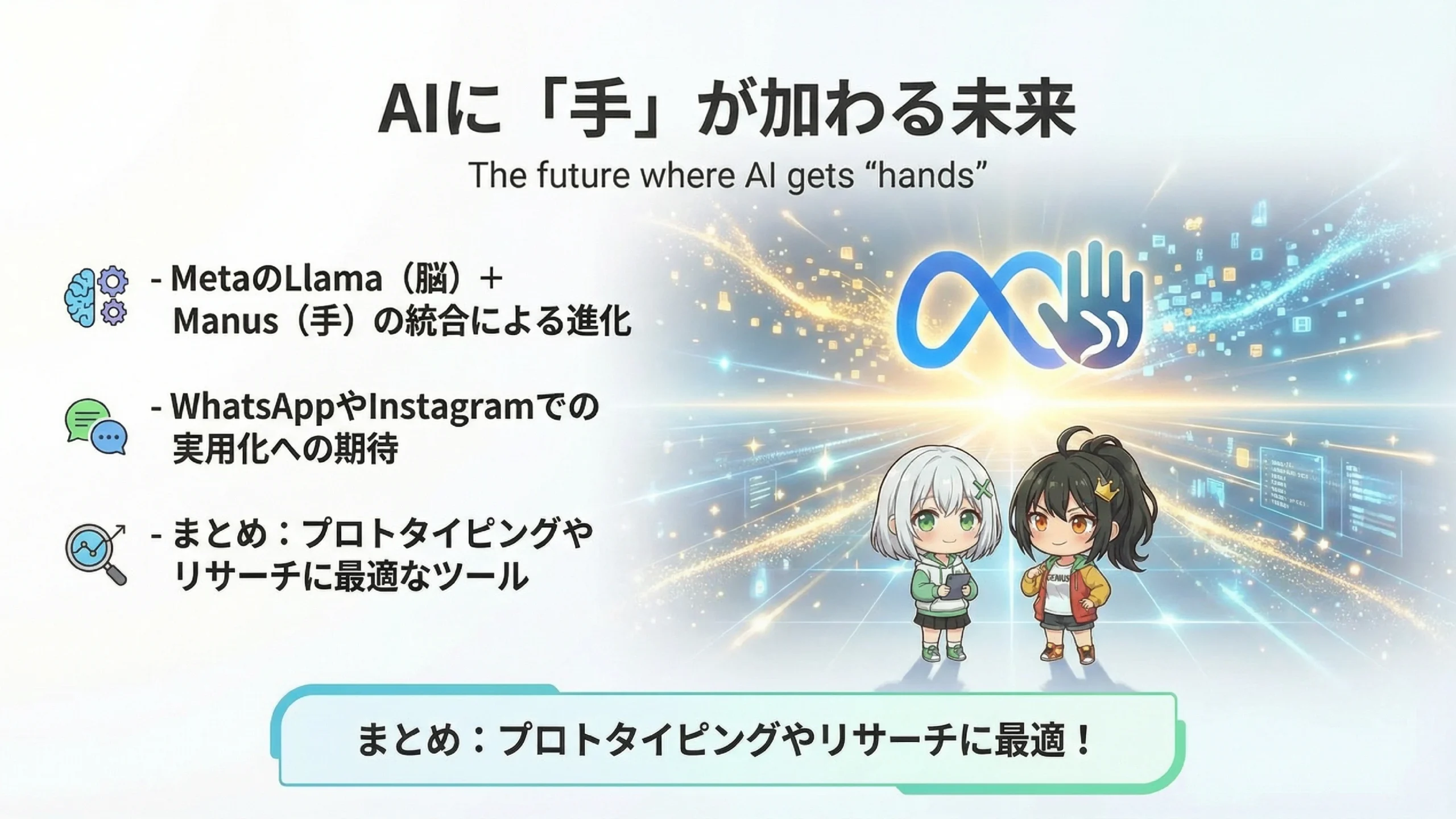 Metaは自社で「Llama」という強力なAIモデルを開発していますが、それはあくまで「脳」でした。Manusを買収することで、Llamaに「手」を与えることになります。つまり、考えるだけでなく実行できるAIが手に入るわけですね。