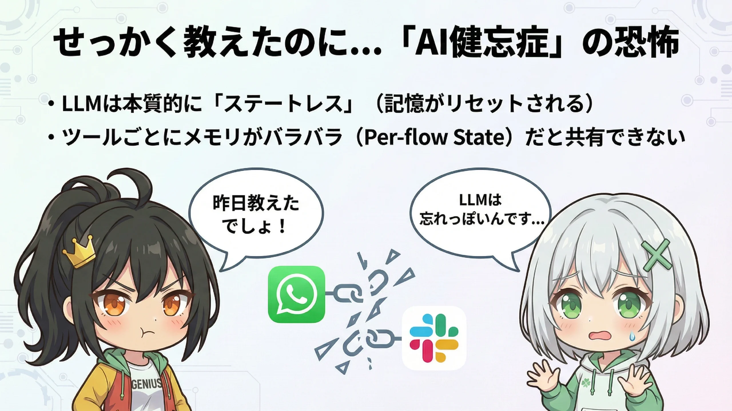 (やっぱりそうなってましたか...)それ、「Per-flow State」っていう設計で、残念ながら限界があるんです。WhatsAppで話した内容をSlackのエージェントは知らないし、セッションが切れたら情報が消えてしまうことも多いんですよ。