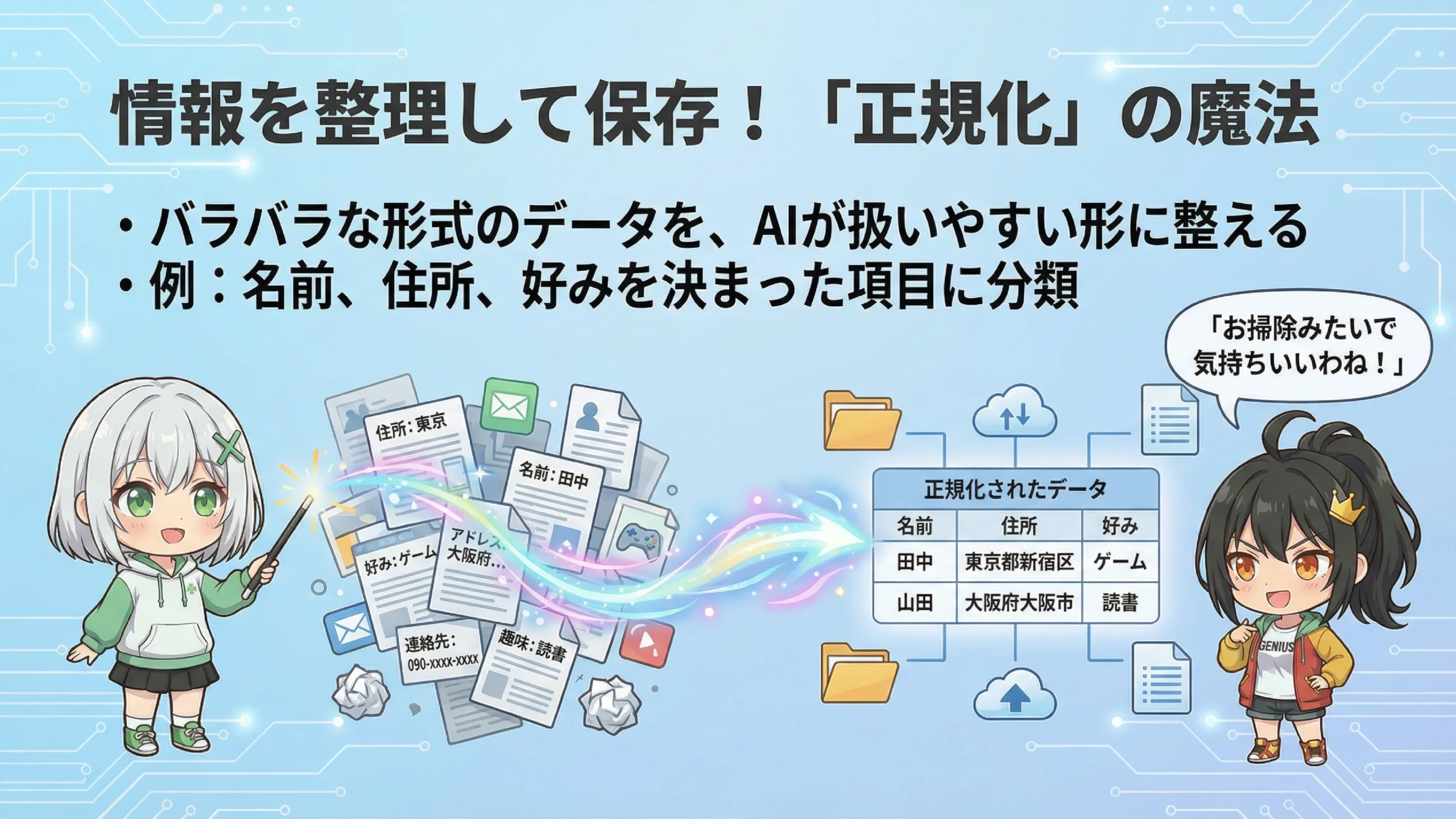なるほどね。正規化で情報を整理して保存して、ハイドレーションで必要なときに取り出してAIに渡す...サイクルが回ってるのね。
