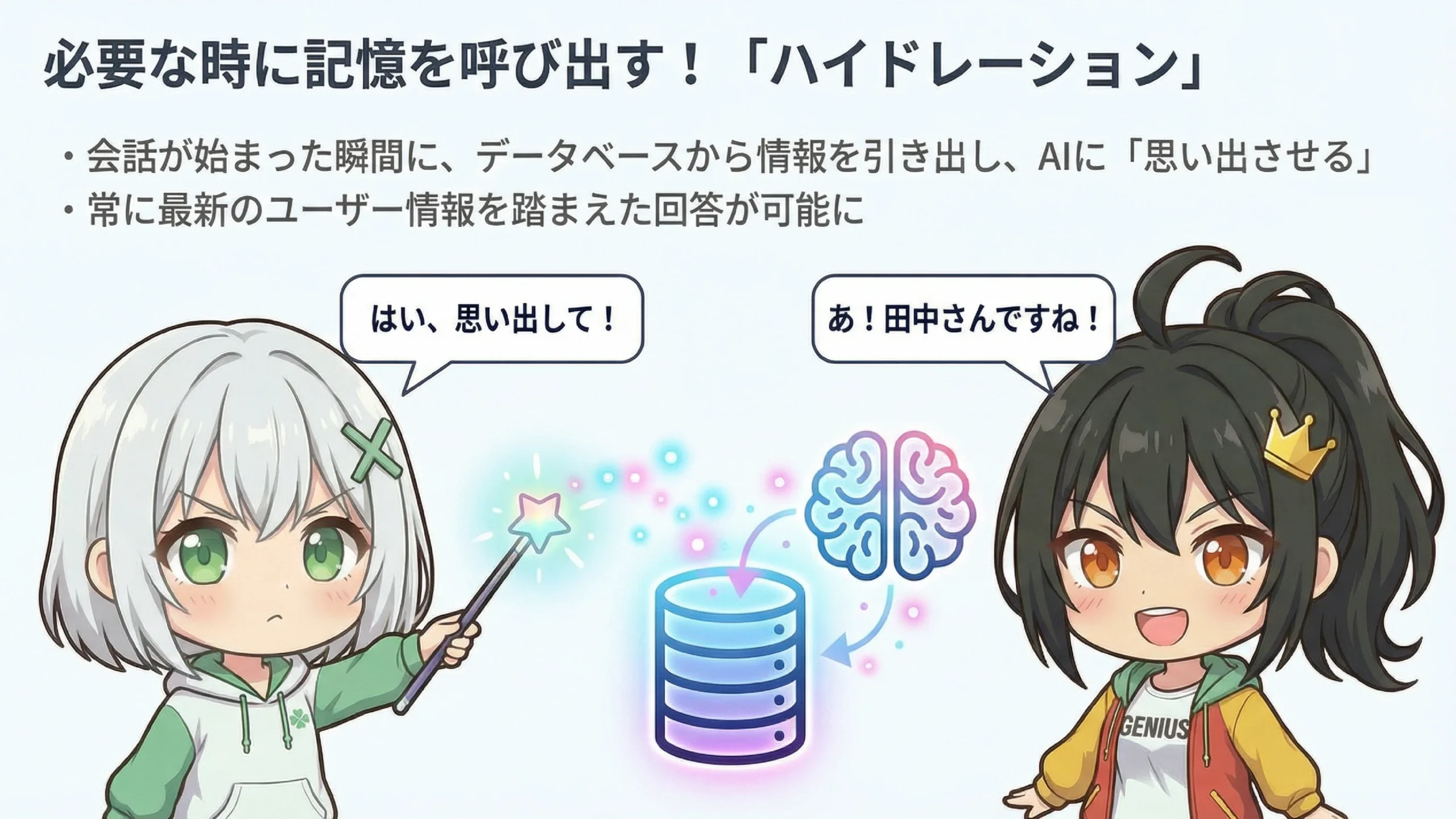 - ハイドレーション:推論前にデータベースから文脈を取得してAIに注入