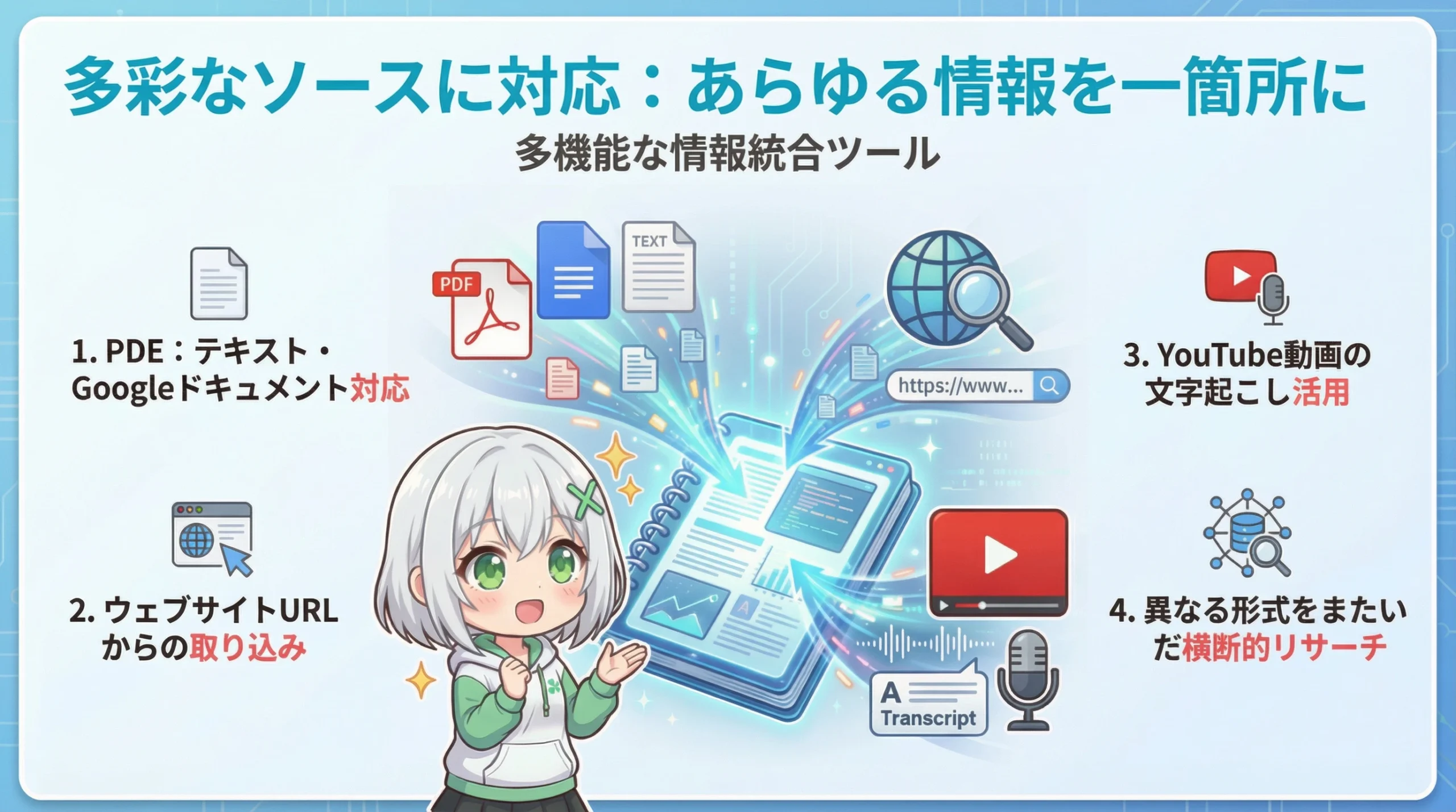 つまり、PDF、動画、音声、Webページ...いろんな形式の資料を一か所にまとめて、横断的に質問できるってことね!