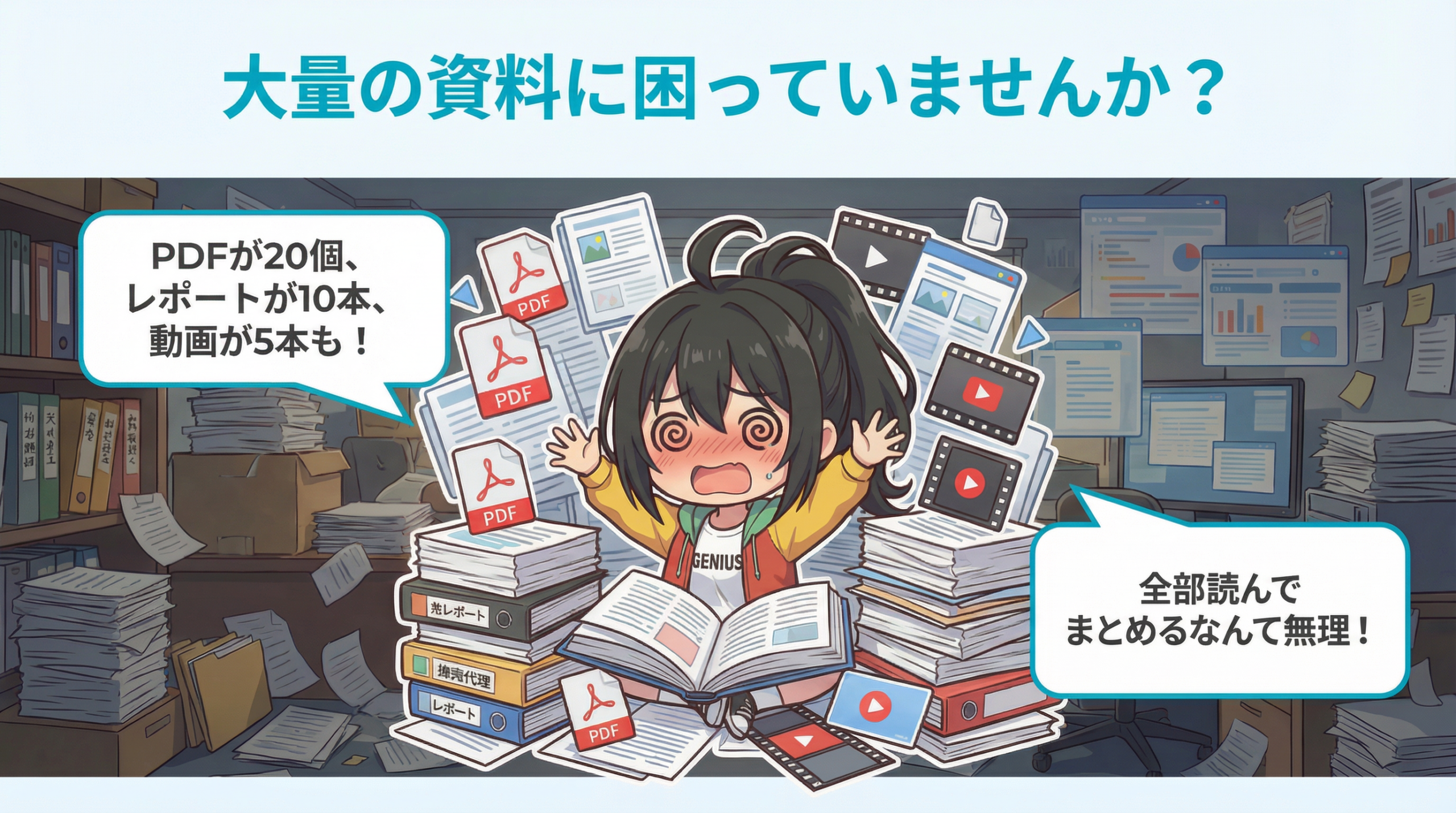 新しいプロジェクトの資料がね、PDFが20個、レポートが10本、YouTubeの解説動画が5本もあるのよ!全部読んでまとめるなんて無理じゃない!?