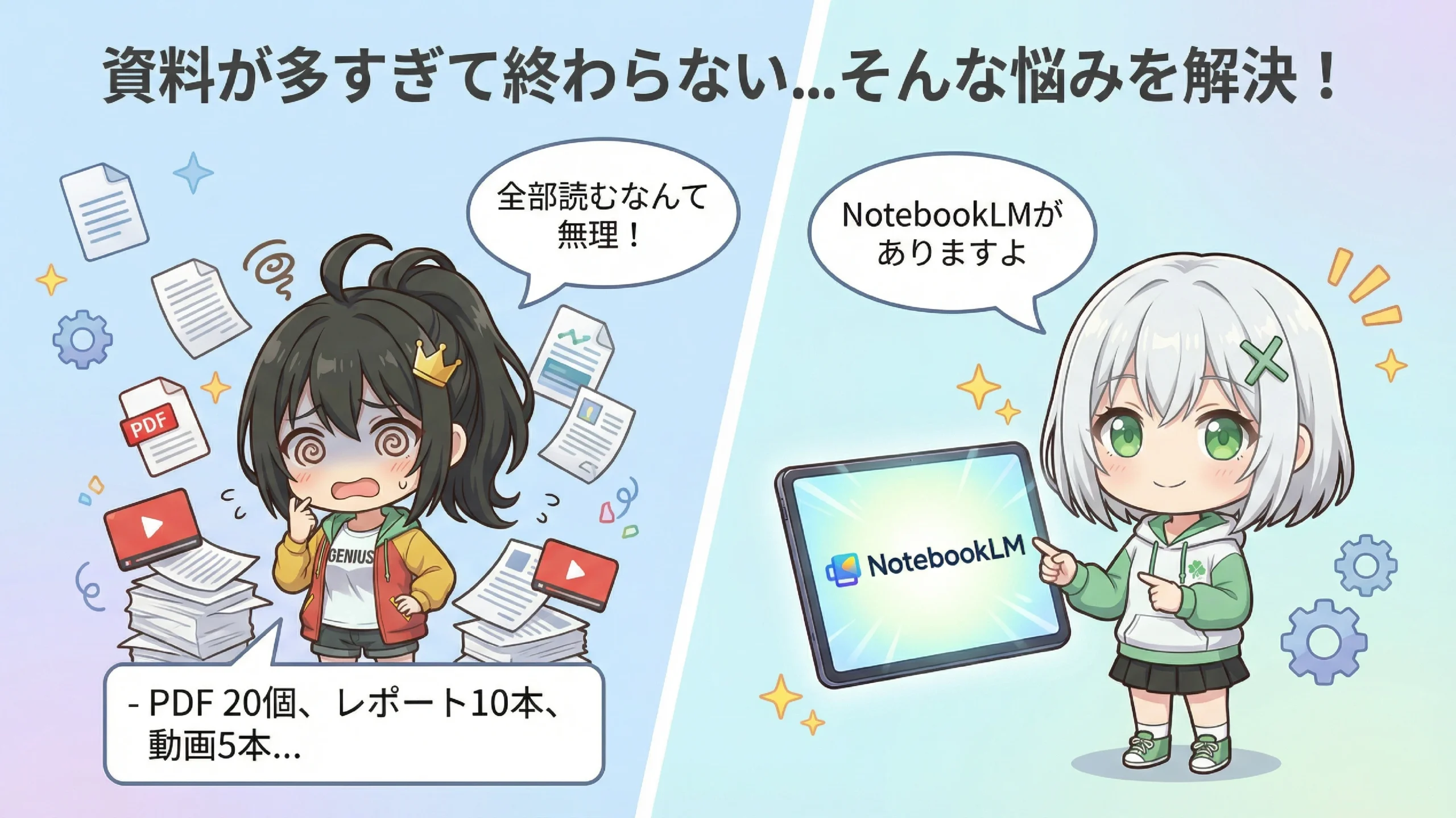 新しいプロジェクトの資料がね、PDFが20個、レポートが10本、YouTubeの解説動画が5本もあるのよ!全部読んでまとめるなんて無理じゃない!?
