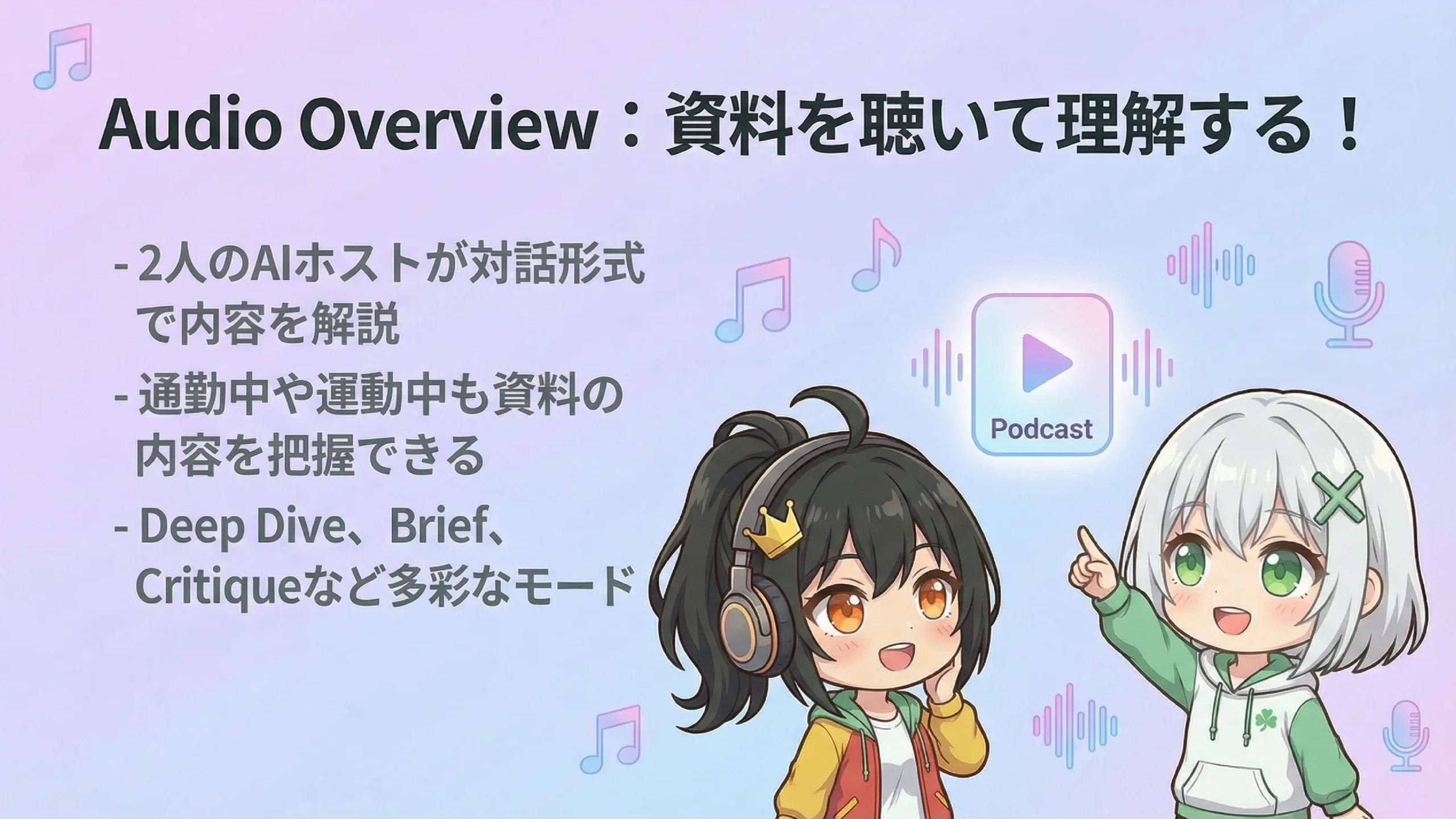そうなんです!しかも単なる読み上げじゃなくて、ホスト同士が質問し合ったり、比喩を使って分かりやすく説明してくれたりするんですよ。通勤中とか、運動中でも資料の内容を把握できるので、時間の有効活用にもなります。