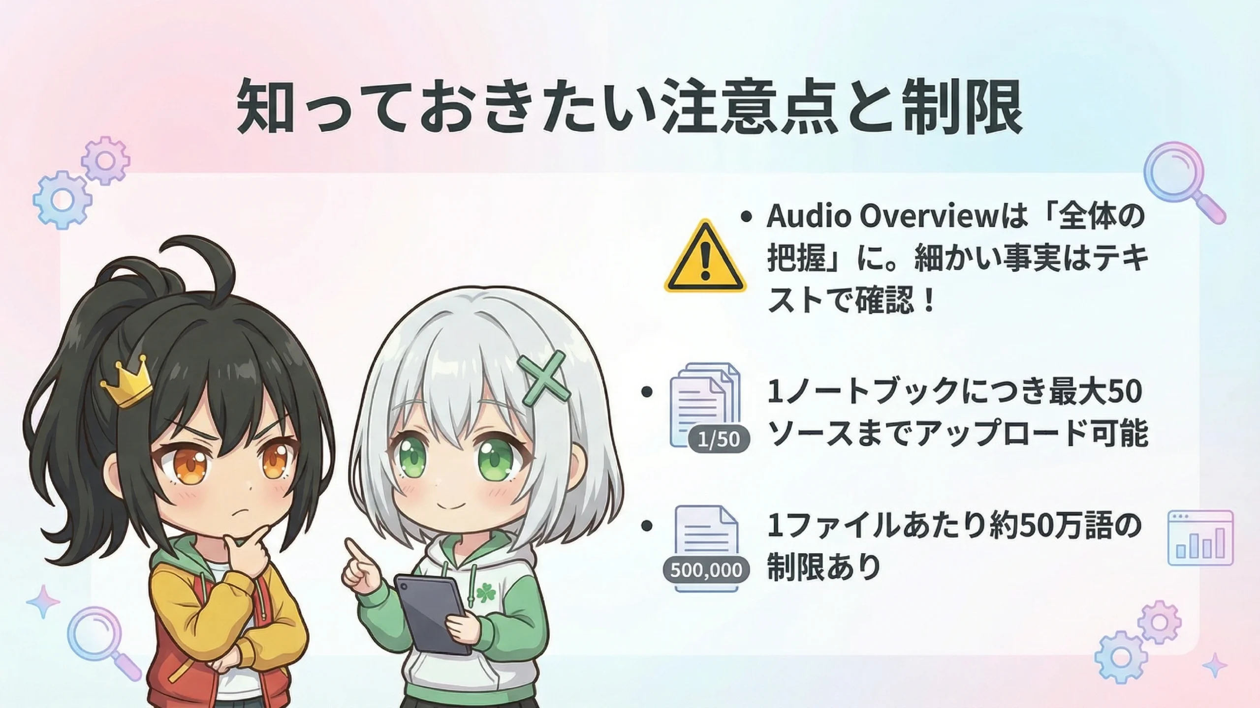 いい視点ですね。いくつか注意点があります。まず、Audio Overview機能については、話を面白くしようとするあまり、資料にない情報を追加してしまうことがあるみたいなんです。